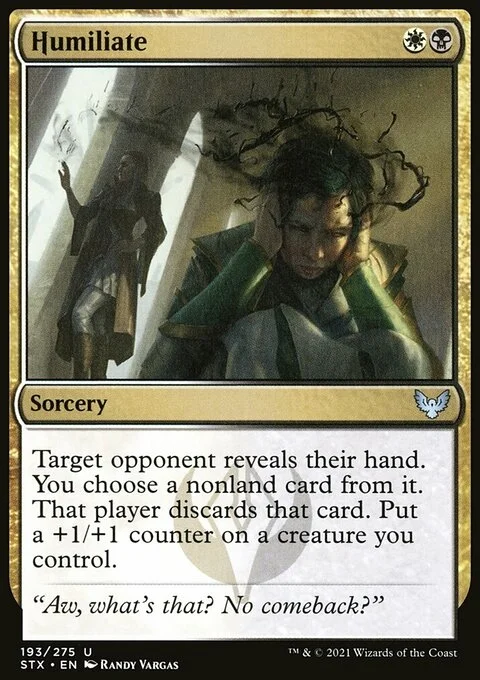 Target opponent reveals their hand. You choose a nonland card from it. That player discards that card. Put a +1/+1 counter on a creature you control.