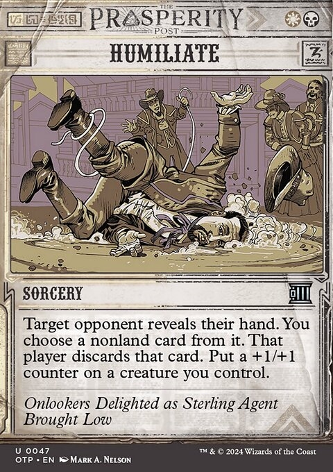 Target opponent reveals their hand. You choose a nonland card from it. That player discards that card. Put a +1/+1 counter on a creature you control.