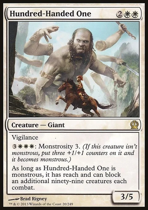 As long as Hundred-Handed One is monstrous, it has reach and can block an additional ninety-nine creatures each combat.