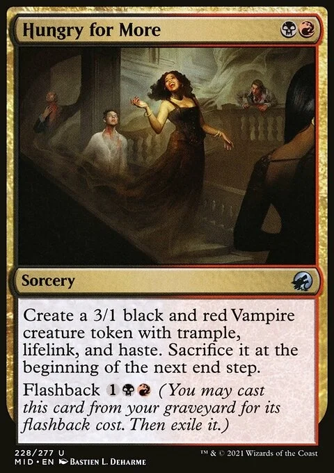 Create a 3/1 black and red Vampire creature token with trample, lifelink, and haste. Sacrifice it at the beginning of the next end step. Flashback {1}{B}{R} (You may cast this card from your graveyard for its flashback cost. Then exile it.)