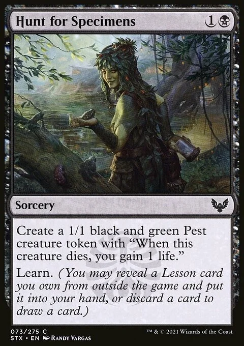 Create a 1/1 black and green Pest creature token with "When this creature dies, you gain 1 life." Learn. (You may reveal a Lesson card you own from outside the game and put it into your hand, or discard a card to draw a card.)
