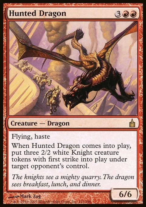 Flying, haste When Hunted Dragon enters the battlefield, target opponent creates three 2/2 white Knight creature tokens with first strike.