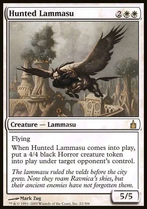 Flying When Hunted Lammasu enters the battlefield, target opponent creates a 4/4 black Horror creature token.