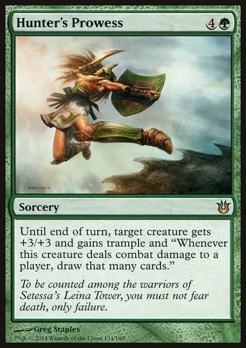 Until end of turn, target creature gets +3/+3 and gains trample and "Whenever this creature deals combat damage to a player, draw that many cards."