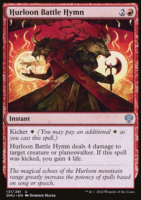 Kicker {W} (You may pay an additional {W} as you cast this spell.) Hurloon Battle Hymn deals 4 damage to target creature or planeswalker. If this spell was kicked, you gain 4 life.