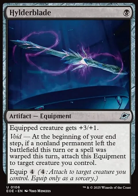 Void — At the beginning of your end step, if a nonland permanent left the battlefield this turn or a spell was warped this turn, attach this Equipment to target creature you control.