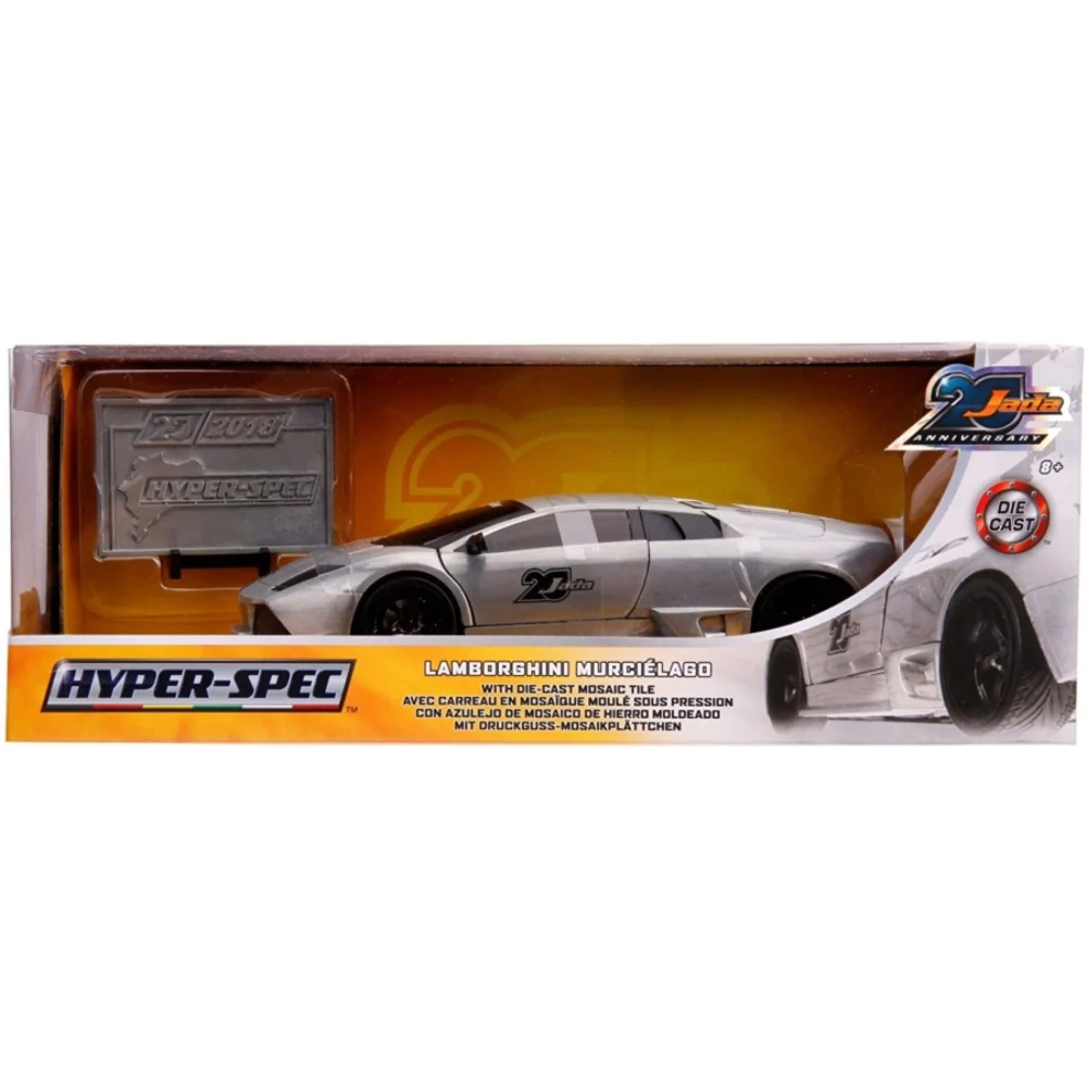 The Lamborghini Murcielago Vehicle Replica is a 1/24 scale model replica featuring real rubber tyres, opening doors, hood, trunk, and an eye-catching silvery paint job. The vehicle replica also comes with a Mosiac Tile celebrating Jada's 20th Anniversary, perfect for displaying alongside the iconic super car!