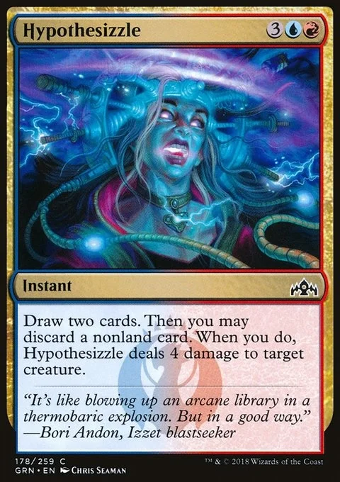 Draw two cards. Then you may discard a nonland card. When you do, Hypothesizzle deals 4 damage to target creature.