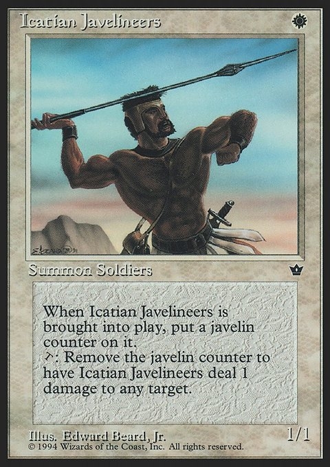This creature enters with a javelin counter on it. {T}, Remove a javelin counter from this creature: It deals 1 damage to any target.