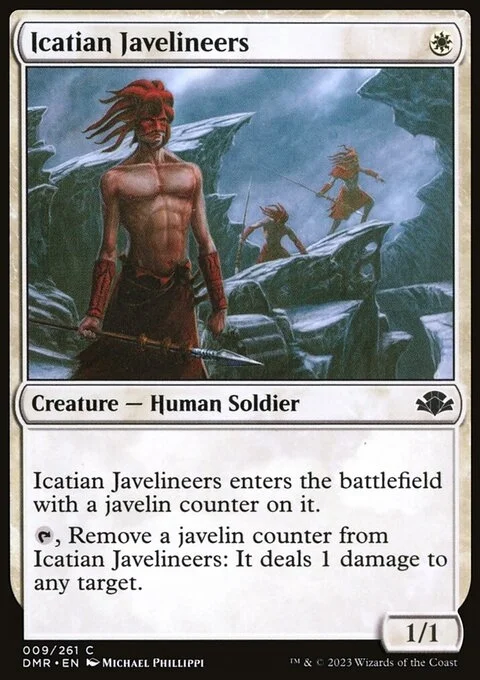 This creature enters with a javelin counter on it. {T}, Remove a javelin counter from this creature: It deals 1 damage to any target.
