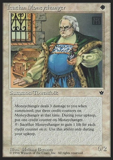 Sacrifice Icatian Moneychanger: You gain 1 life for each credit counter on Icatian Moneychanger. Activate only during your upkeep.