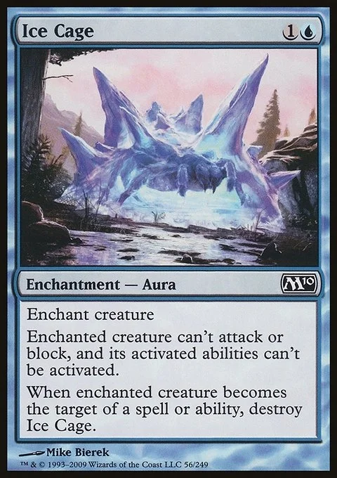 Enchant creature Enchanted creature can't attack or block, and its activated abilities can't be activated. When enchanted creature becomes the target of a spell or ability, destroy Ice Cage.