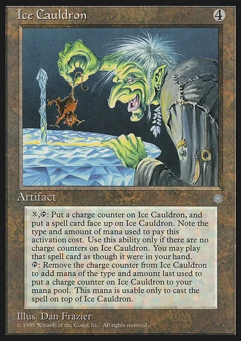 X, T: Put a charge counter on Ice Cauldron, and put a spell card face up on Ice Cauldron. Note the type and amount of mana used to pay this activation cost. Use this ability only if there are no charge counters on Ice Cauldron. You may play that spell card as though it were in your hand. T: Remove the charge counter from Ice Cauldron to add mana of the type and amount last used to put a charge counter on Ice Cauldron to your mana pool. This mana is usable only to cast the spell on top of Ice Cauldron.