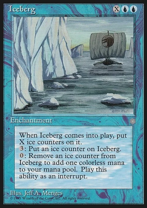 When Iceberg comes into play, put X ice counters on it.3: Put an ice counter on Iceberg.0: Remove an ice counter from Iceberg to add one colorless mana to your mana pool. Play this ability as an interrupt.