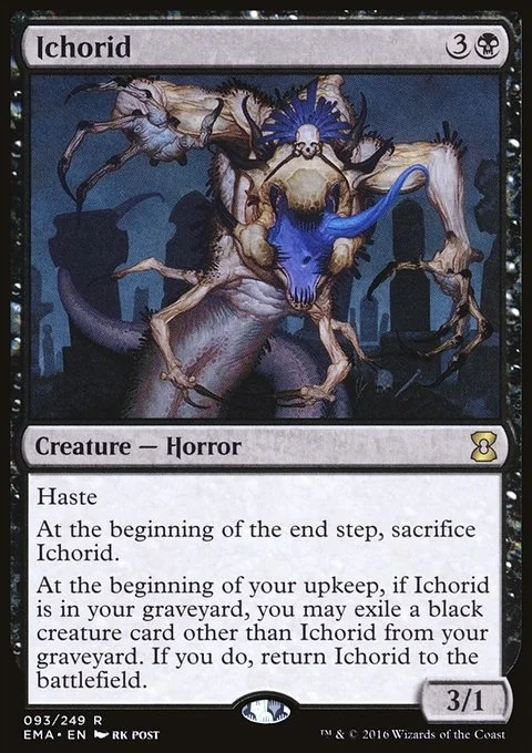 Haste At the beginning of the end step, sacrifice Ichorid. At the beginning of your upkeep, if Ichorid is in your graveyard, you may exile a black creature card other than Ichorid from your graveyard. If you do, return Ichorid to the battlefield.