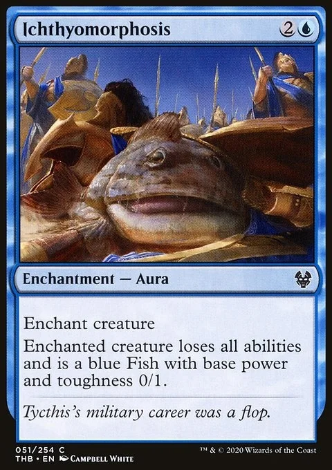 Enchant creature Enchanted creature loses all abilities and is a blue Fish with base power and toughness 0/1.