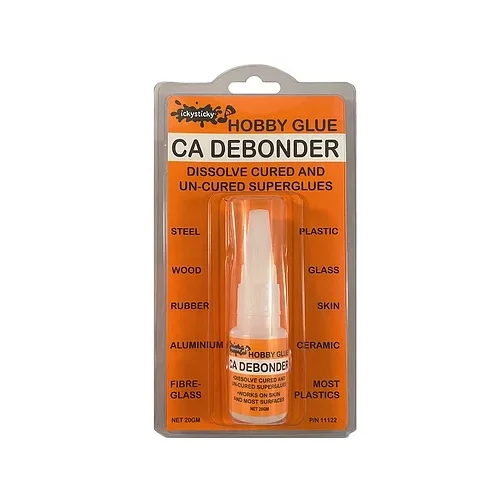 ICKYSTICKY CA Debonder is a clear solvent blend with a relatively low evaporation rate that dissolves cured or un-cured ICKYSTICKY range of CA HOBBY GLUES.