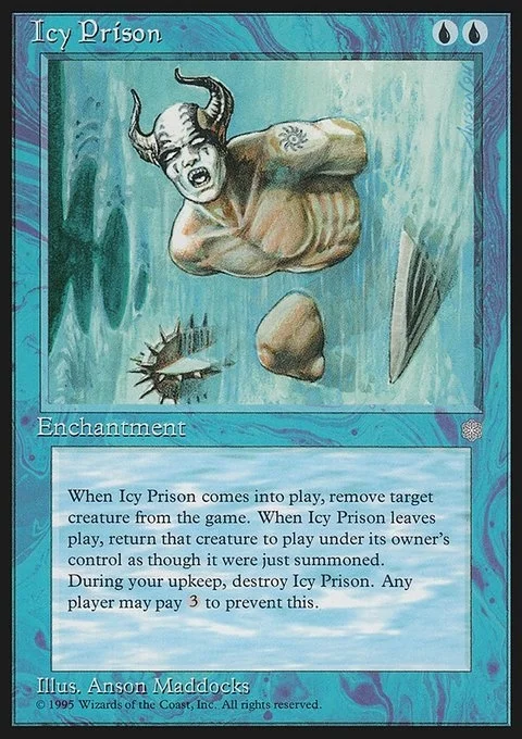 When Icy Prison comes into play, remove target creature from the game. When Icy Prison leaves play, return that creature to play under its owner’s control as though it were just summoned. During your upkeep, destroy Icy Prison. Any player may pay 3 to prevent this.