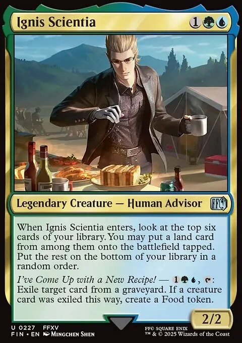 When Ignis Scientia enters, look at the top six cards of your library. You may put a land card from among them onto the battlefield tapped. Put the rest on the bottom of your library in a random order. I've Come Up with a New Recipe! — {1}{G}{U}, {T}: Exile target card from a graveyard. If a creature card was exiled this way, create a Food token.