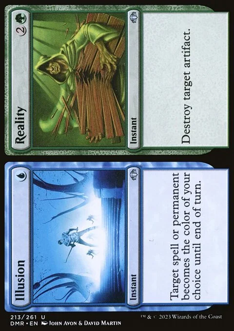 Illusion Target spell or permanent becomes the color of your choice until end of turn. Reality Destroy target artifact.