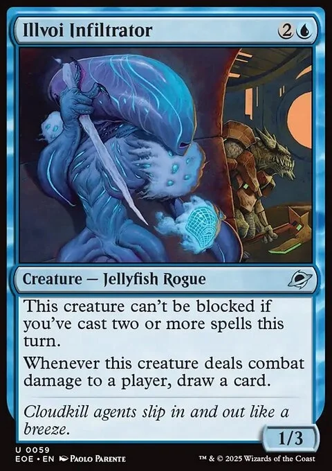 This creature can't be blocked if you've cast two or more spells this turn. Whenever this creature deals combat damage to a player, draw a card.