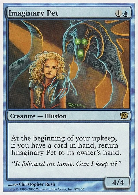 At the beginning of your upkeep, if you have a card in hand, return Imaginary Pet to its owner’s hand.
