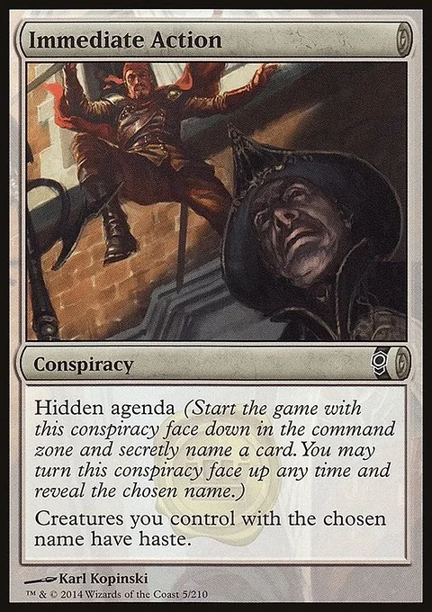 Hidden agenda (Start the game with this conspiracy face down in the command zone and secretly choose a card name. You may turn this conspiracy face up any time and reveal that name.) Creatures you control with the chosen name have haste.
