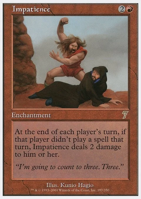 At the beginning of each player's end step, if that player didn't cast a spell this turn, Impatience deals 2 damage to that player.
