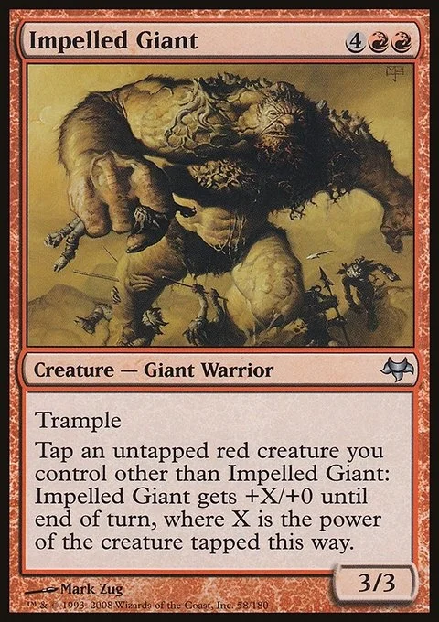 Trample Tap an untapped red creature you control other than Impelled Giant: Impelled Giant gets +X/+0 until end of turn, where X is the power of the creature tapped this way.