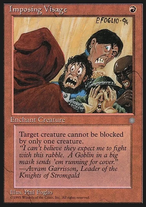 Enchant creature Enchanted creature has menace. (It can't be blocked except by two or more creatures.)