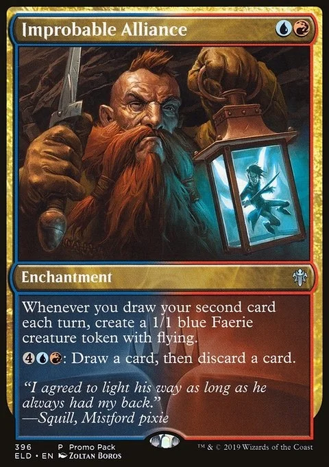 Whenever you draw your second card each turn, create a 1/1 blue Faerie creature token with flying. {4}{U}{R}: Draw a card, then discard a card.