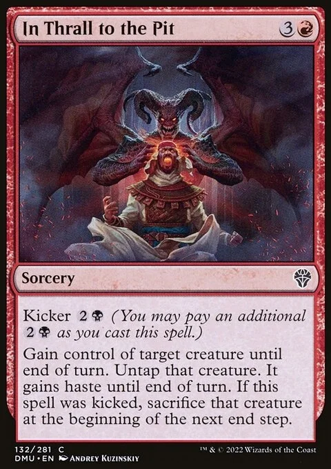 Kicker {2}{B} (You may pay an additional {2}{B} as you cast this spell.) Gain control of target creature until end of turn. Untap that creature. It gains haste until end of turn. If this spell was kicked, sacrifice that creature at the beginning of the next end step.
