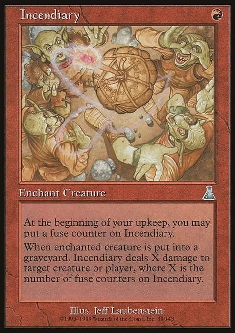 At the beginning of your upkeep, you may put a fuse counter on Incendiary.When enchanted creature is put into a graveyard, Incendiary deals X damage to target creature or player, where X is the number of fuse counters on Incendiary.