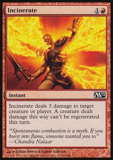 Incinerate deals 3 damage to any target. A creature dealt damage this way can't be regenerated this turn.