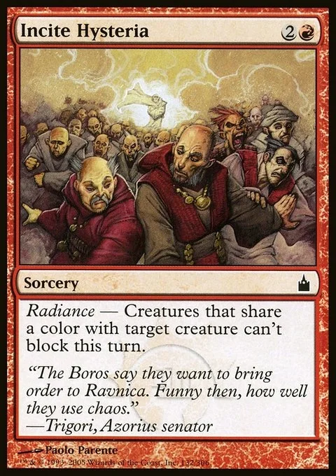 Radiance — Until end of turn, target creature and each other creature that shares a color with it gain "This creature can't block."