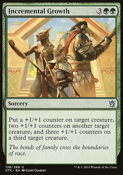 Put a +1/+1 counter on target creature, two +1/+1 counters on another target creature, and three +1/+1 counters on a third target creature.