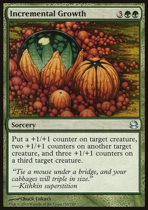 Put a +1/+1 counter on target creature, two +1/+1 counters on another target creature, and three +1/+1 counters on a third target creature.