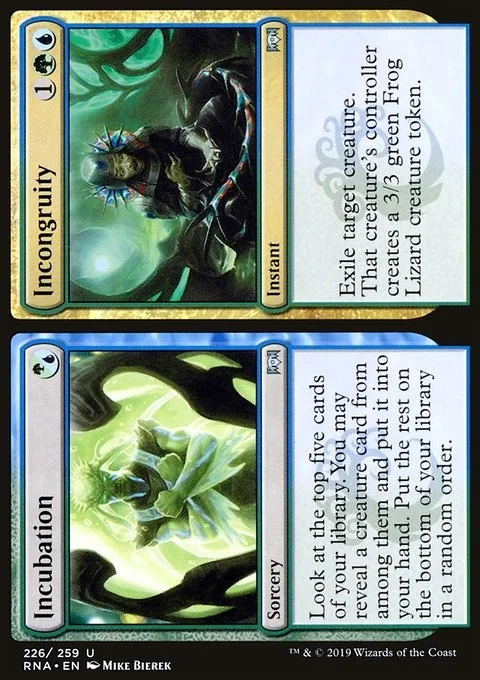 Incubation Look at the top five cards of your library. You may reveal a creature card from among them and put it into your hand. Put the rest on the bottom of your library in a random order. Incongruity Exile target creature. That creature's controller creates a 3/3 green Frog Lizard creature token.