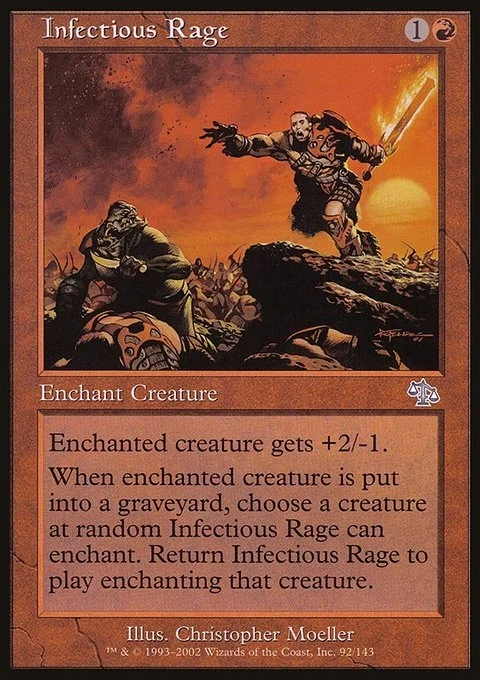 Enchant creature Enchanted creature gets +2/-1. When enchanted creature dies, choose a creature at random Infectious Rage can enchant. Return Infectious Rage to the battlefield attached to that creature.