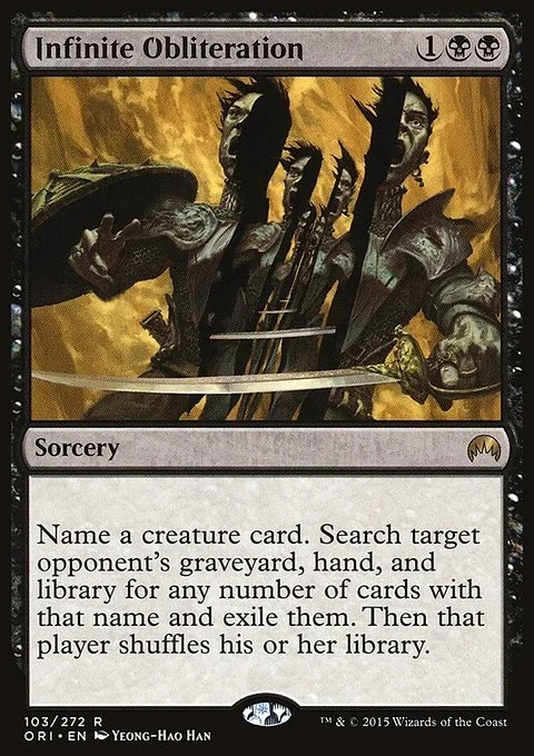 Choose a creature card name. Search target opponent's graveyard, hand, and library for any number of cards with that name and exile them. Then that player shuffles their library.