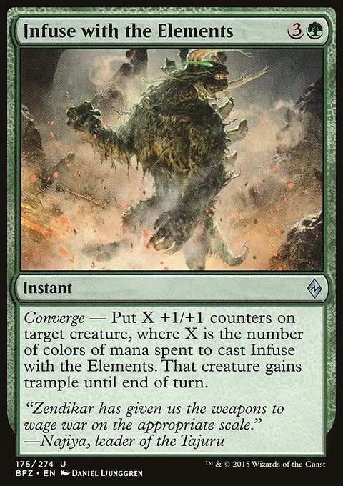 Converge — Put X +1/+1 counters on target creature, where X is the number of colors of mana spent to cast Infuse with the Elements. That creature gains trample until end of turn.
