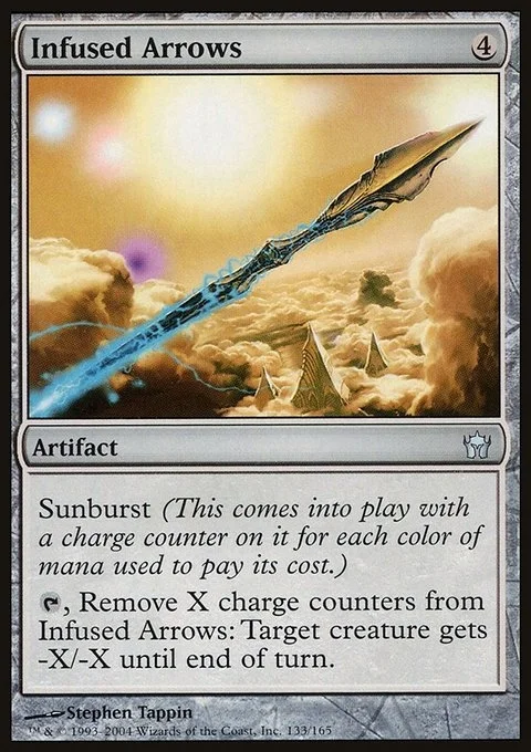 Sunburst (This enters the battlefield with a charge counter on it for each color of mana spent to cast it.) {T}, Remove X charge counters from Infused Arrows: Target creature gets -X/-X until end of turn.