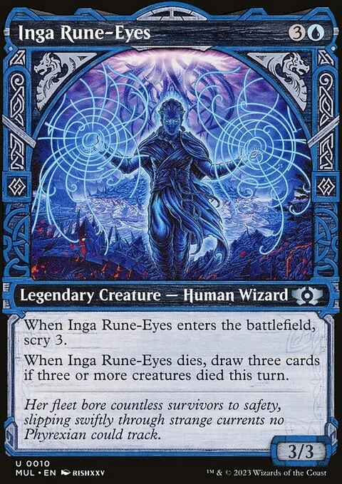 When Inga Rune-Eyes enters the battlefield, scry 3. When Inga Rune-Eyes dies, draw three cards if three or more creatures died this turn.