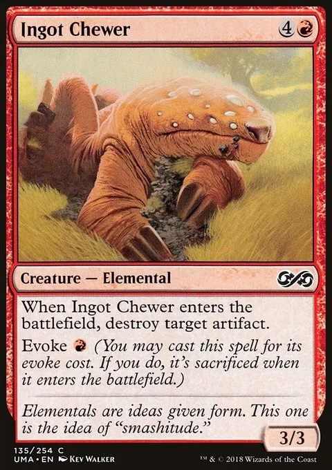 When Ingot Chewer enters the battlefield, destroy target artifact. Evoke {R} (You may cast this spell for its evoke cost. If you do, it's sacrificed when it enters the battlefield.)