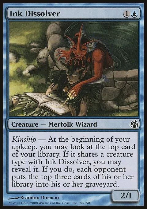 Kinship — At the beginning of your upkeep, you may look at the top card of your library. If it shares a creature type with Ink Dissolver, you may reveal it. If you do, each opponent mills three cards.