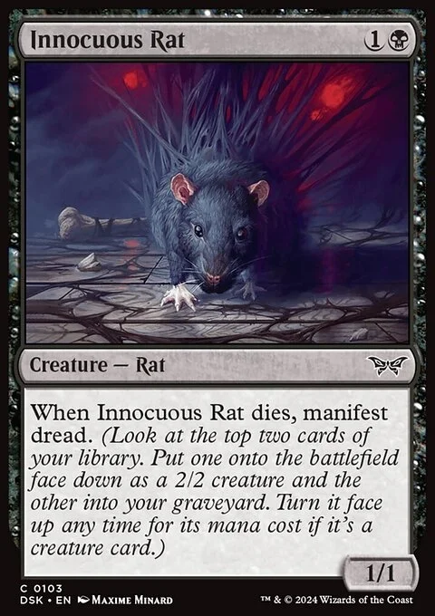When Innocuous Rat dies, manifest dread. (Look at the top two cards of your library. Put one onto the battlefield face down as a 2/2 creature and the other into your graveyard. Turn it face up any time for its mana cost if it's a creature card.)