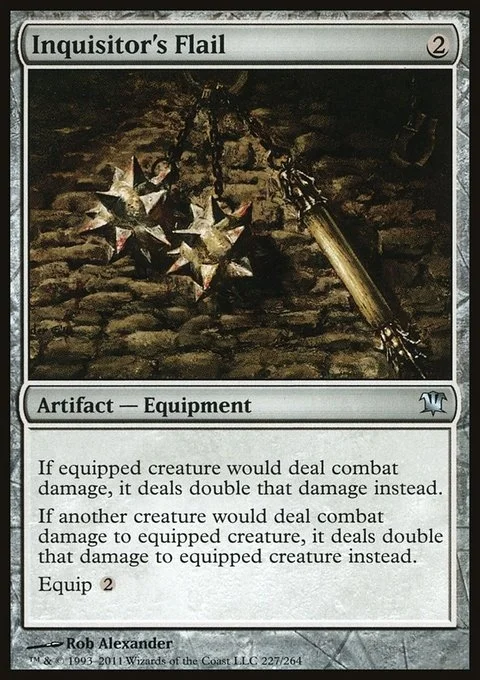 If equipped creature would deal combat damage, it deals double that damage instead. If another creature would deal combat damage to equipped creature, it deals double that damage to equipped creature instead. Equip {2}