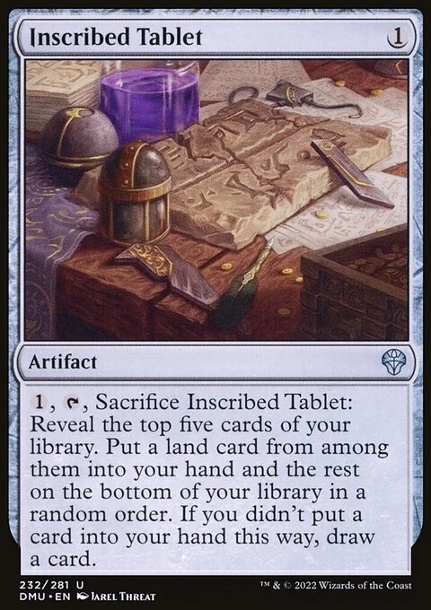 {1}, {T}, Sacrifice Inscribed Tablet: Reveal the top five cards of your library. Put a land card from among them into your hand and the rest on the bottom of your library in a random order. If you didn't put a card into your hand this way, draw a card.