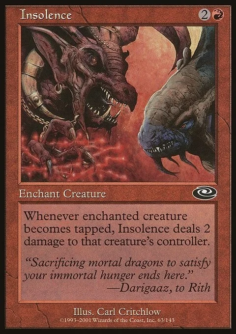 Enchant creature Whenever enchanted creature becomes tapped, Insolence deals 2 damage to that creature's controller.