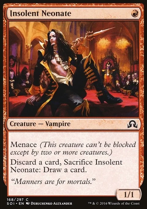 Menace (This creature can't be blocked except by two or more creatures.) Discard a card, Sacrifice this creature: Draw a card.